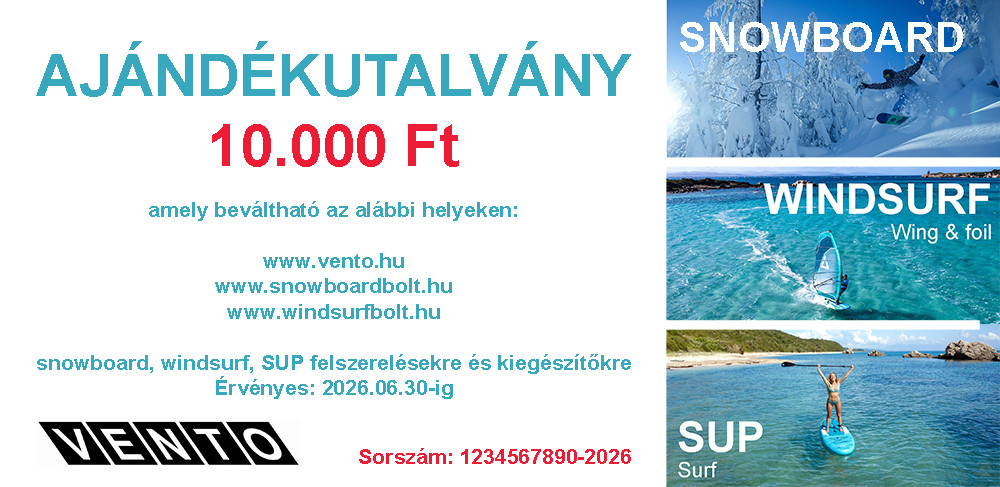 A VENTO ajándékutalvány a snowboardbolt.hu, windsurfbolt.hu és a vento.hu webshop termékeire váltható be. Az utalványok egyedi sorszámmal rendelkeznek, és 2026. június 30-ig válthatók be.